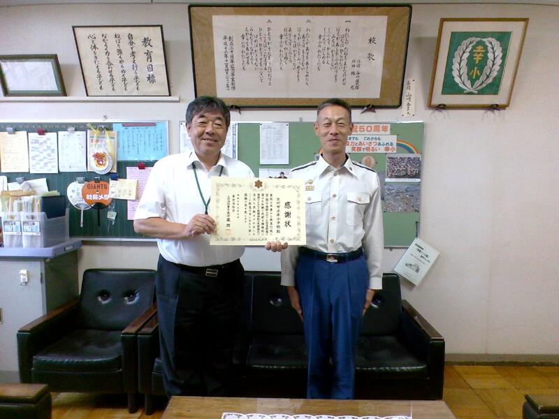 この日、立川消防署長がお見えになり、校長式で授与式が行われ、校長が教職員を代表して感謝状を受け取りました。