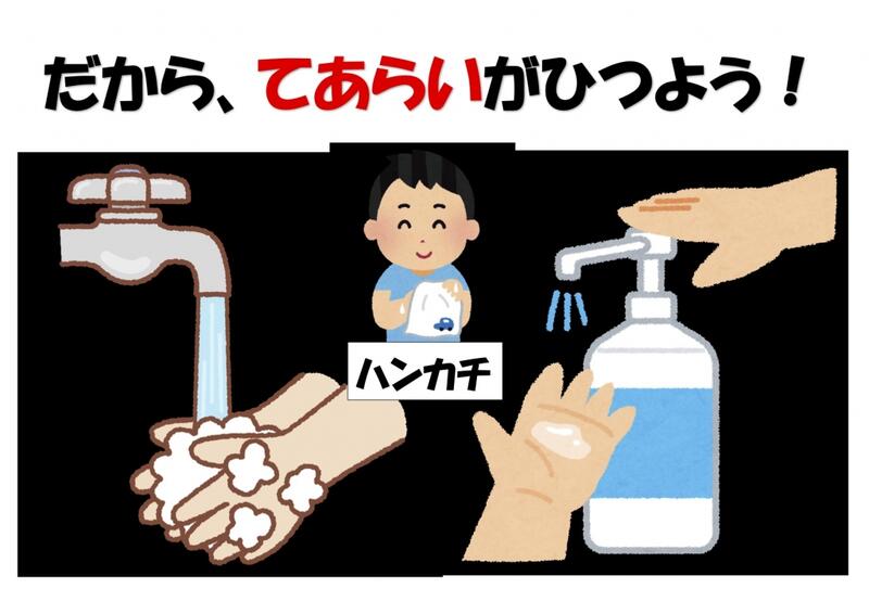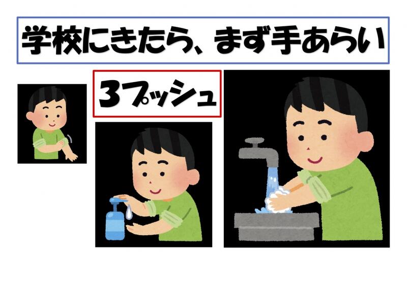新型コロナウイルス感染症対策では、通常の風邪や季節性インフルエンザ対策と同様に、お一人お一人の咳エチケットや手洗いなどの実施がとても重要です。子供たちには、外から帰った時などに、必ず手洗いをしっかりするとともに、正しい知識に基づいて冷静に行動するよう指導してください。