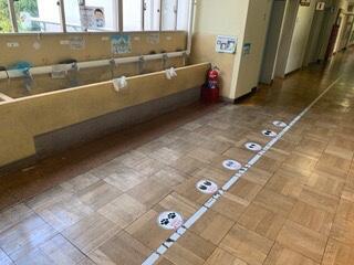 | フィジカルディスタンスを確保したグループワーク | マスクを着用した授業 | 手洗い場のマーカー設置 |