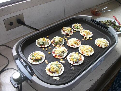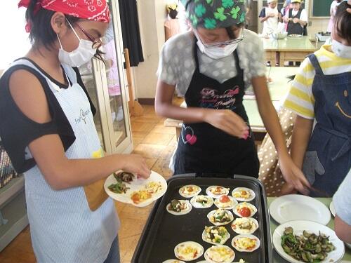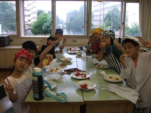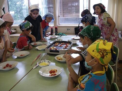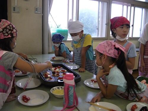 科室で行いました。収穫したミニトマトを使って、ミニビザ作りでした。1・2校