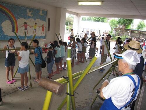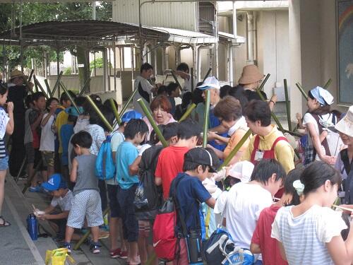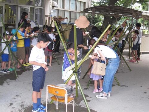 本日、梅雨明けした青空の下、10:00から3回に分けて、放課後子供教室「むぎっこクラブ」主催による、≪流しソーメン≫のイベントが行われました。