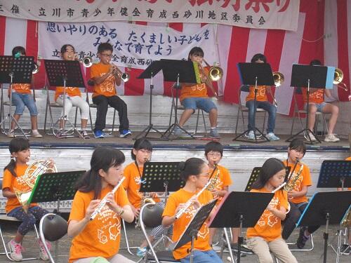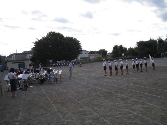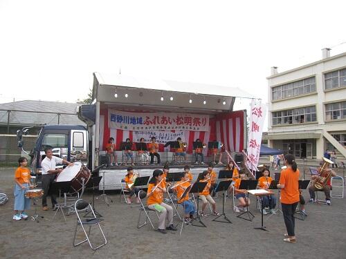 8月21日(日)に台風の影響が心配される中、西砂小学校の校庭で、西砂川青少健主催の地域最大イベント「松明祭り」が行われました。吹奏楽クラブが、今年も演奏してきました。今年度は新入部員も多いのですが、練習の成果を発揮すべく、「松中小の校歌」「アメージンググレース」「士官候補生」の3曲を演奏してきました。