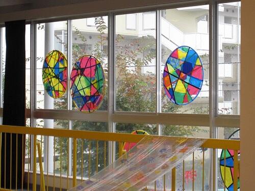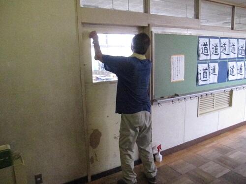 各教室の廊下側扉の窓ガラスに飛散防止フイルムを貼っています。