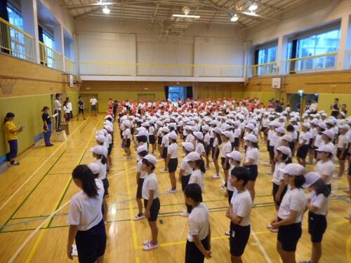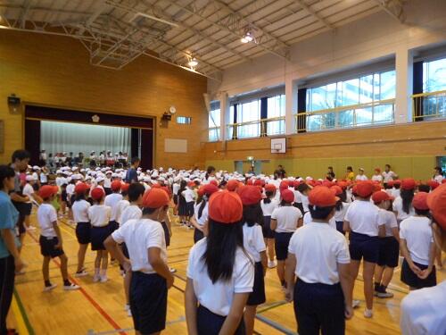 13日(火)は、朝の体育朝会から1時間目が運動会全校練習の1回目でした。あいにくの雨のため、体育館で行いました。開閉会式の練習を中心に、その場での行進練習・運動会の歌など、元気いっぱいのエネルギーで体育館が熱気を帯びていました。