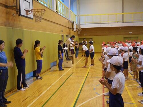 7月20日は、1校時に体育館で終業式がありました。校長の話に続いて、児童代表で、3年生の植松巧光さんと那須さくらさんが、1学期を振り返ってお話をしてくれました。その後、どのクラスも4校時には、「あゆみ」が手渡されました。