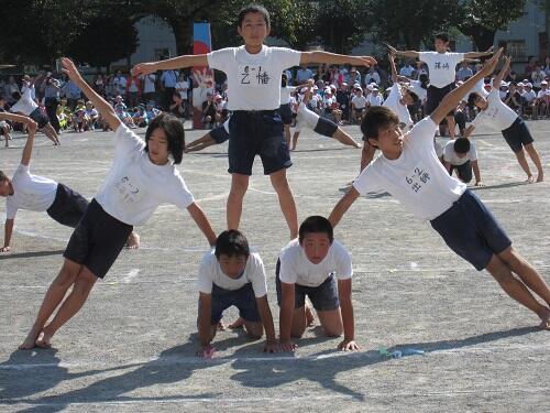 「6年組体操 ~感謝と笑顔~」です。演技中の緊張感ある引き締まった表情、そして、すべてを出し切った後、退場するときの笑顔がとても素敵でした。