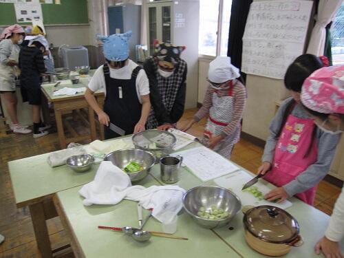 12月6日・7日に、5年生が家庭科の調理実習をしていました。家庭科の「食べて元気!」という単元の学習で、お米を炊きお味噌汁を作りました。