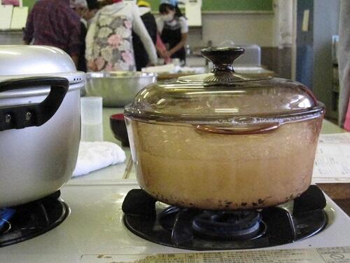 お母さんたちのボランティア欠かせません お米が炊けるのが見れるお釜です