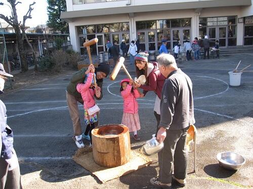 寒い中での開会式 親子で仲良く餅つき体験