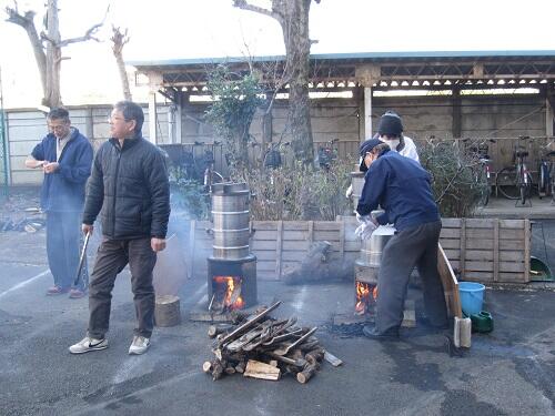 PTAの皆さんもあちらこちらで大活躍 薪をくべて火をたき、お米を蒸します