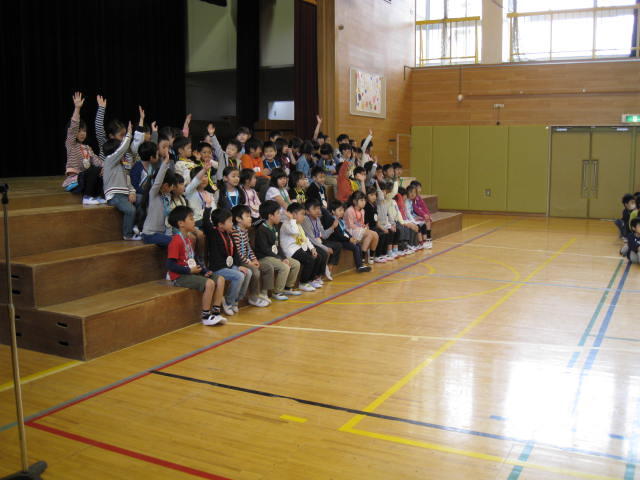 今日は、クラスで取り組んできた長なわを全校で競いました。