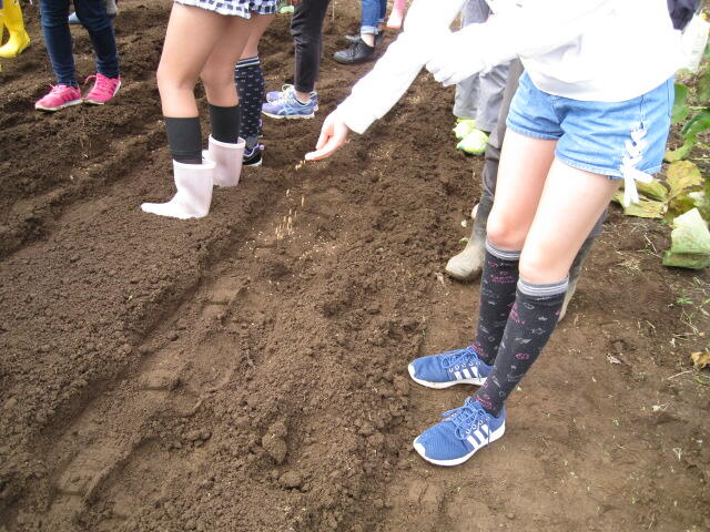 地域の方の畑をお借りして、ご指導したたきながら、麦まき体験をしました。