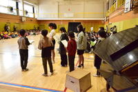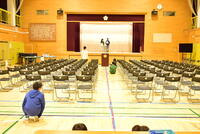 その後、5年生が体育館の卒業式会場を作りました。6年生から「よろしくお願いします」のあいさつを受け、5年生は、少々戸惑いつつ「頑張ります」と答えていました。