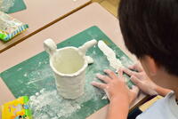 図工は、紙粘土の質感を味わいながら「ペン立て」の制作をしていました。つるつるを目指して広げる子、突起をつけて表現する子、線で模様を描く子、様々です。