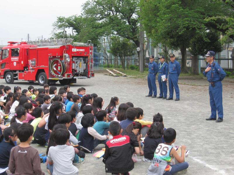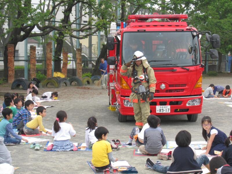 4月27日(木)の3・4校時に校庭で、2・3年生による表題の写生会が行われました。当日は、未明の出動があったにもかかわらず、立川消防署砂川出張所から消防車が来てくれました。