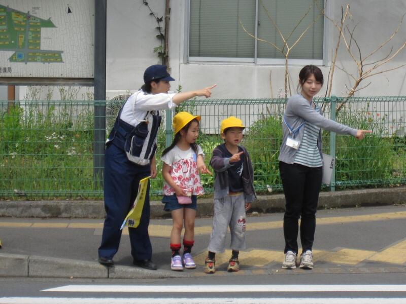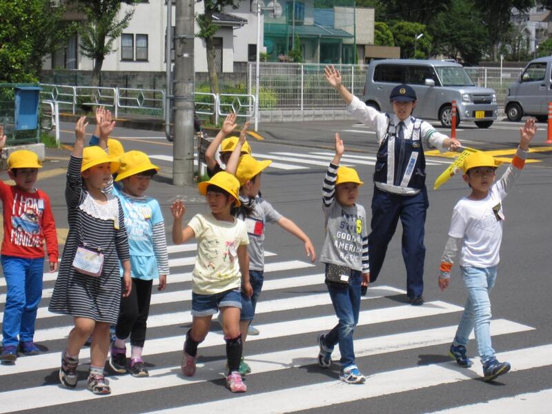 横断歩道は手を挙げ、左右をきょろきょろよく見ましょう!渡る前に、指示さし確認!