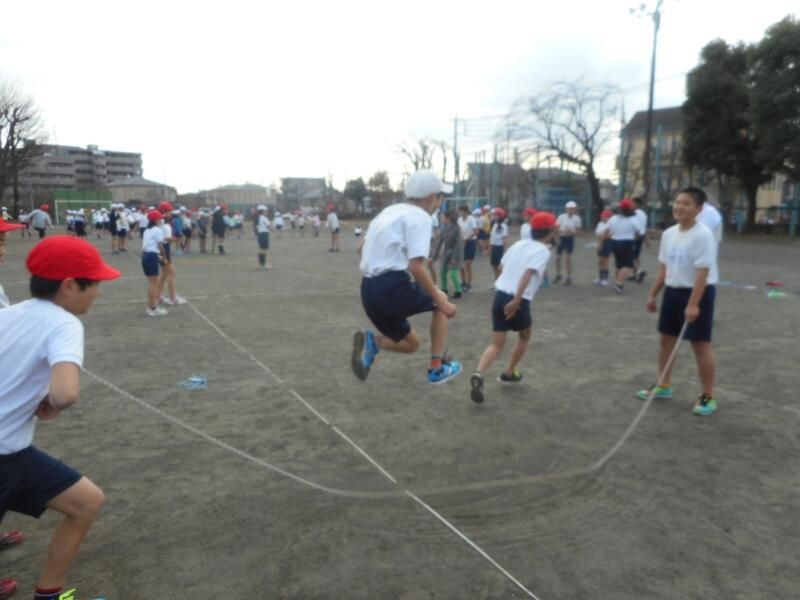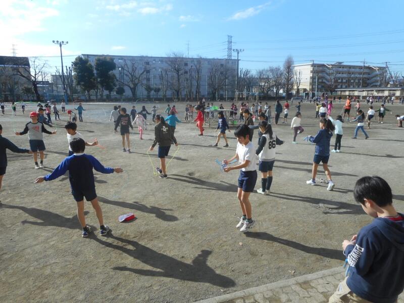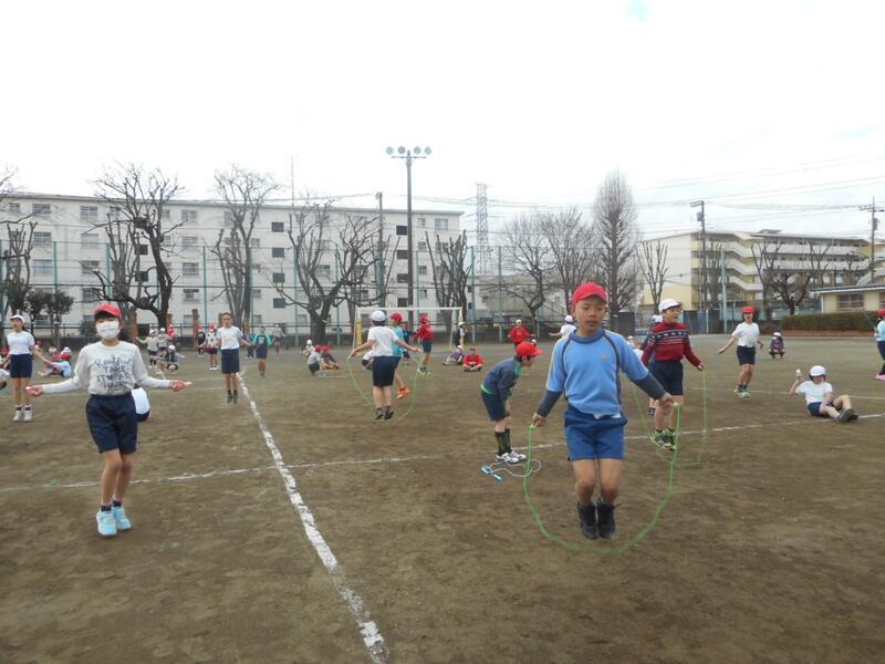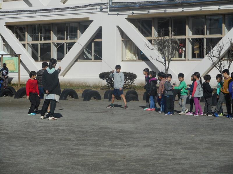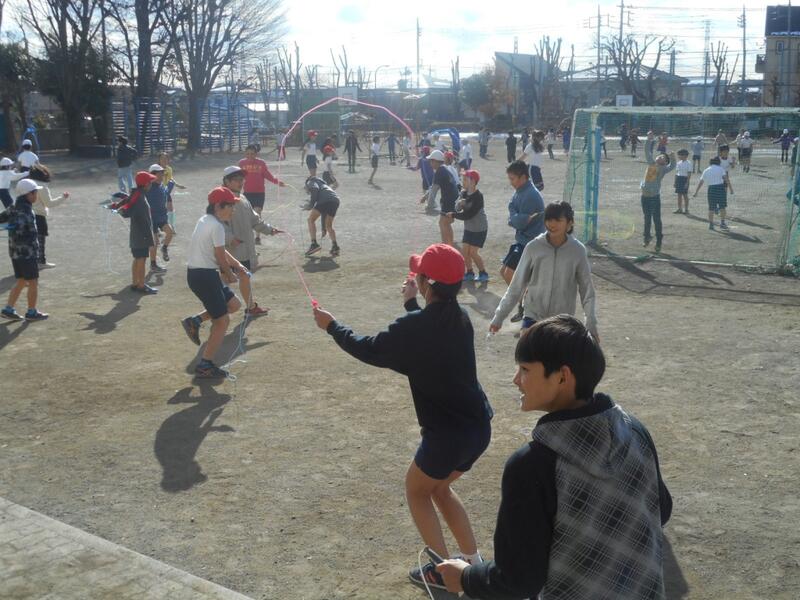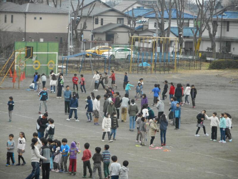 今、中休み。縄跳び週間でたくさんの子供が外に出ています。