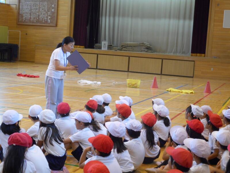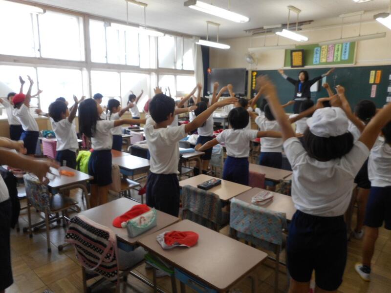 朝、教室で3年生が、ラジオ体操の練習をしていました。