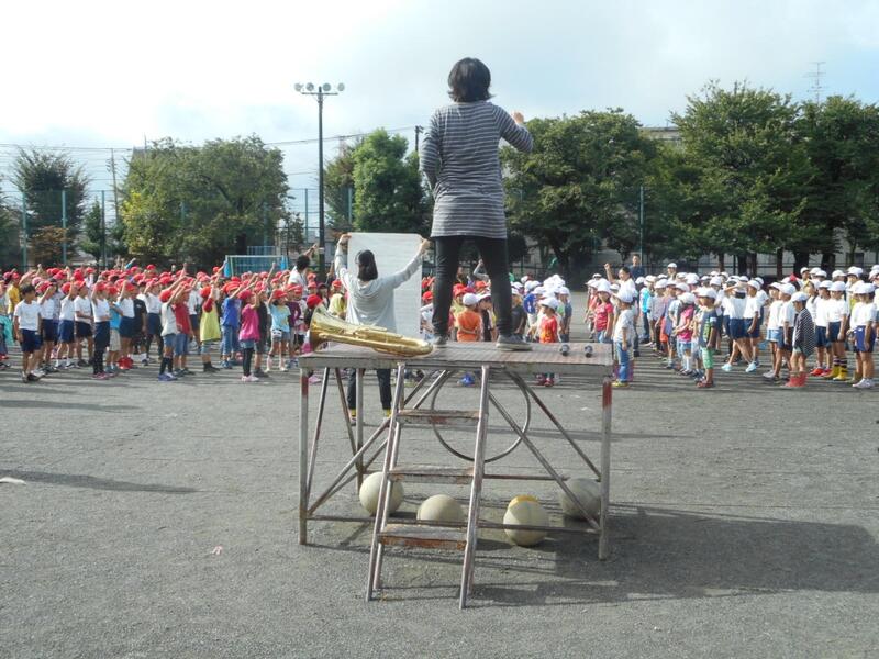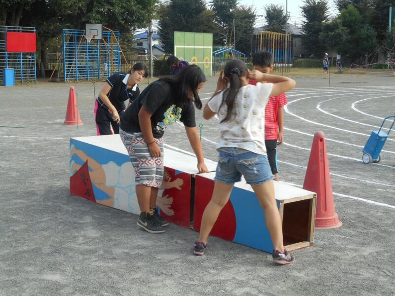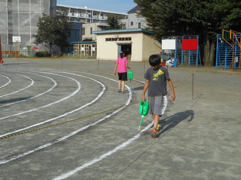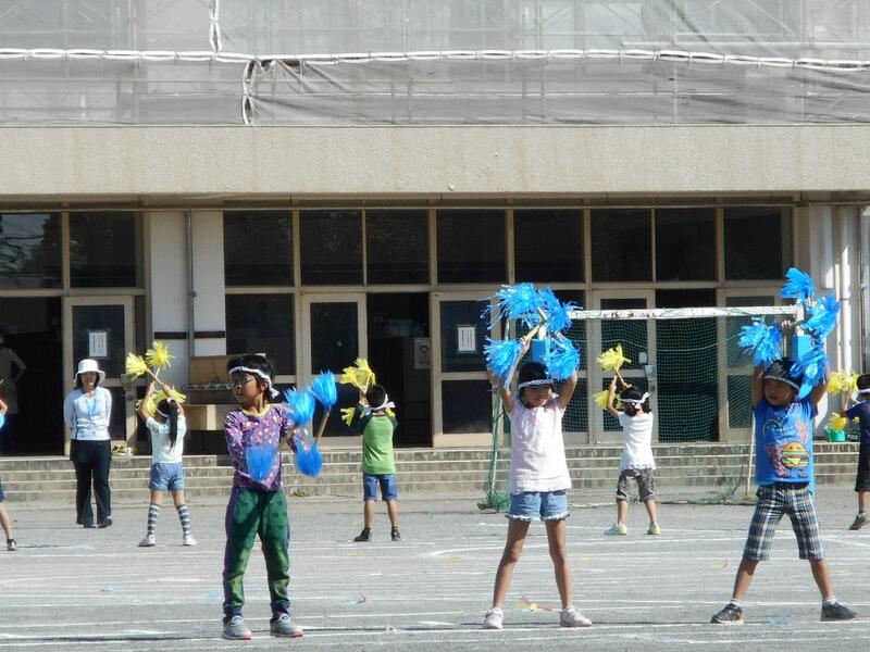 職員室に戻ったら、1年生が玉入れの練習をしていました。頑張って投げています!