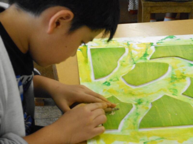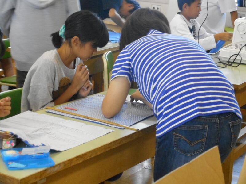 6年の家庭科は、お弁当包みを作っています。お母さん方のボランティアありがとうございます。