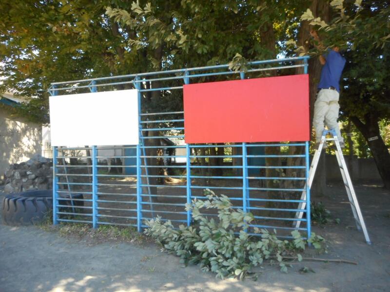 毎年、校舎の2階に掲げていた、紅白の得点板。今年は工事のために別の場所にしなくてはいけません。そこで、先生方が知恵を絞り、いくつか候補の中から、最終的に肋木のところに設置することになりました。今年だけですが、得点係の子供たちの活躍もごらんください。枝で隠れてしまうために用務主事さんが切ってくれました!