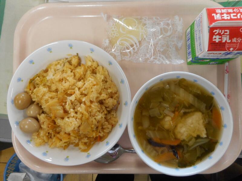 今日の給食は、うずらたまごの醤油煮ととうふ団子のスープ。そしてキムタクごはん!