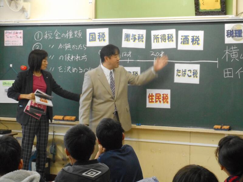 6年生。租税教室です。社会科で教わる内容です。6年生にも分かるように、税の種類や税の使われ方など、優しく教えてくださいました。ありがとうございました。