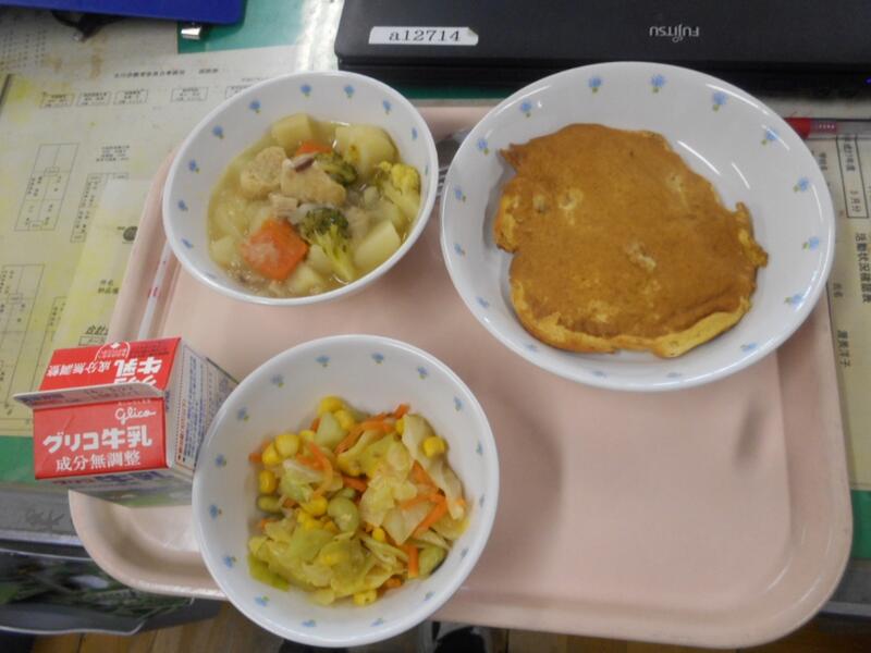 今日の給食は、初登場リンゴのホットケーキ。