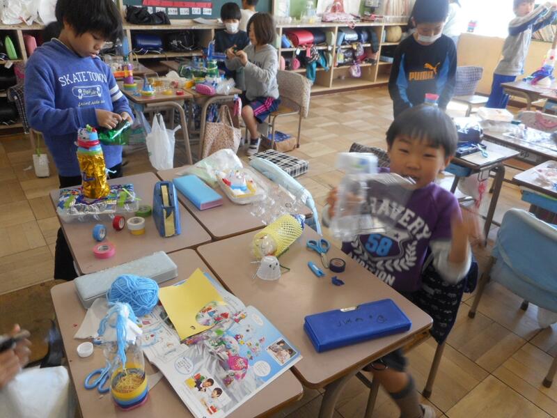 帰りに2年生の教室を見たら、図工をやっていました。透明な容器などを使って