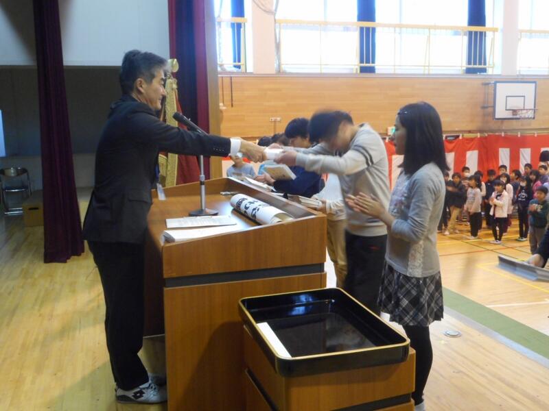 修了式。学級の代表が、校長先生から修了証をいただきました。