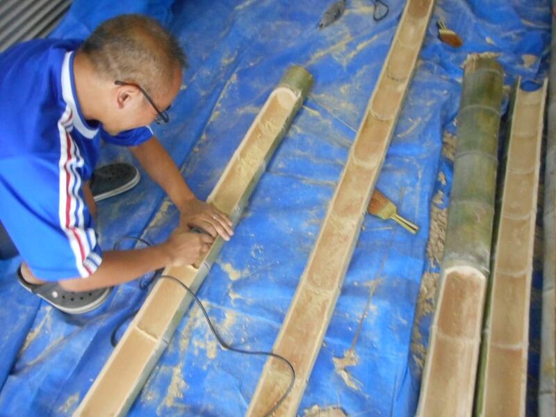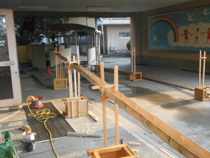本校職員が、地域の立川ひかり保育園の竹を切らせていただき、流しソーメンに使います。職員が仕上げをしているところです。明日には間に合いそうです。お楽しみに!