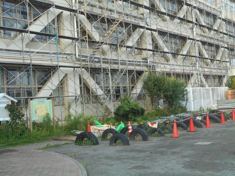 夕方の校舎です。足場が大分できてきました。今後、バリケードを作って、子供たちが危険箇所に入らないようにします。