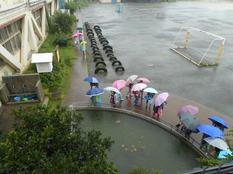 昨日は、台風接近による強い雨で、子供たちもまとまって下校しました。見守りパトロールの皆さんと教職員で、下校の様子を見守りました。学校の池の水が溢れそうで、子供たちが心配そうに見ていました。
