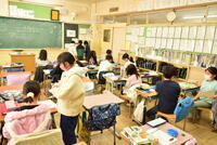 3年生の様子です。1組は、理科の実験中でした。磁石の性質について勉強していました。磁石と金属の間に別なものをはさんでもくっつくのかどうかを調べていました。