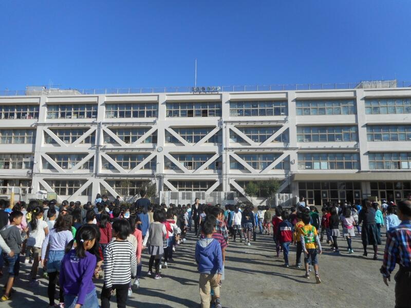 素敵な秋空の学校朝会。まだ、工事中ですが学校の外壁もきれいになりました!