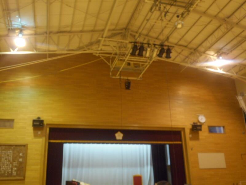 わかりにくいかと思いますが、今日職員が力を合わせてバスケットボードに、演劇発表に使うスポットライトを取り付けました。