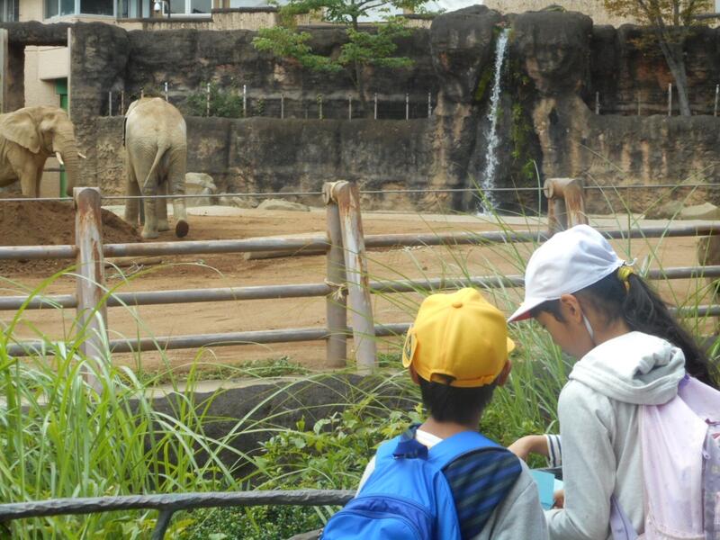 2年生が、アフリカゾウのことについて調べました。それを、1年生に丁寧に教えています。この写真はゾウグループですが、他にオランウータン、モルモット、キリン、チンパンジーの5グループに別れ、グループ行動をしました。