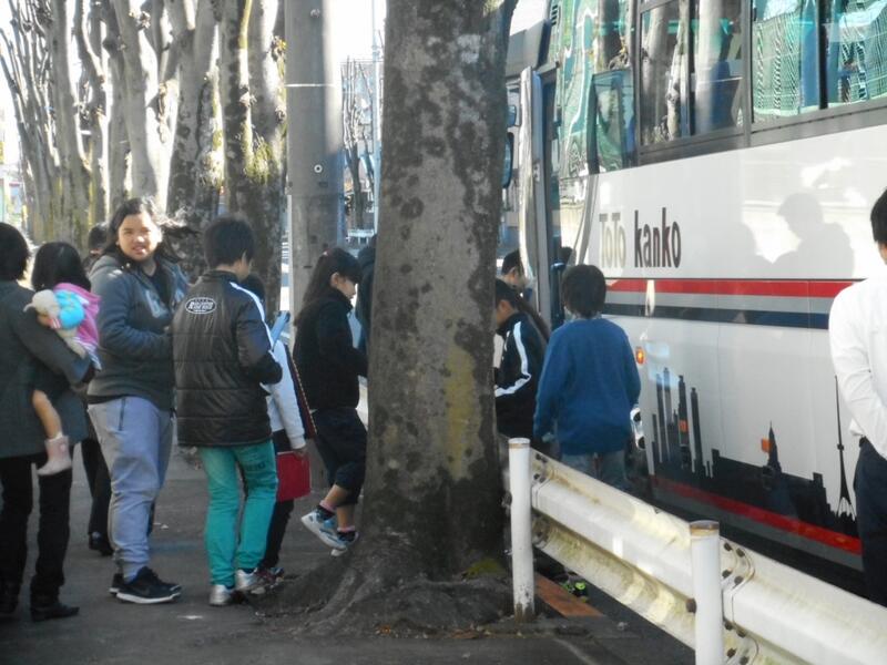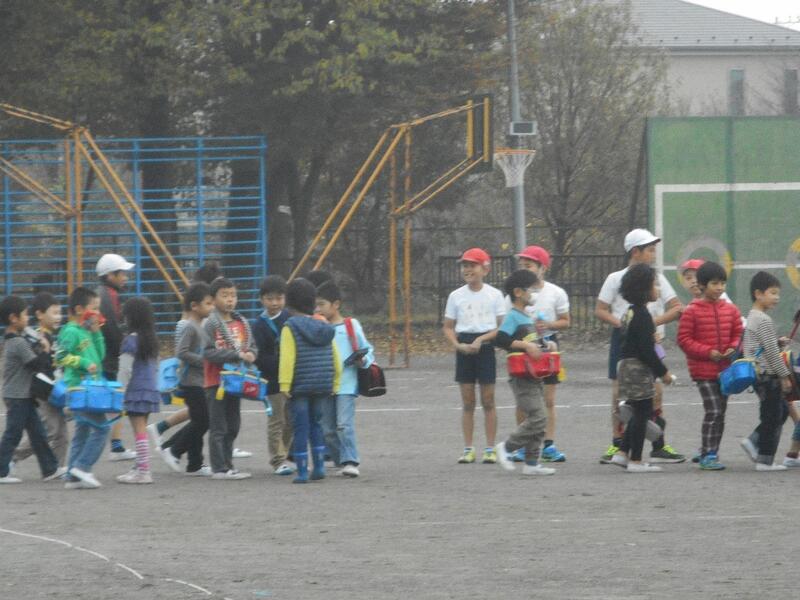 校庭で遊んでいた子供たちは、真ん中に集まってから移動。