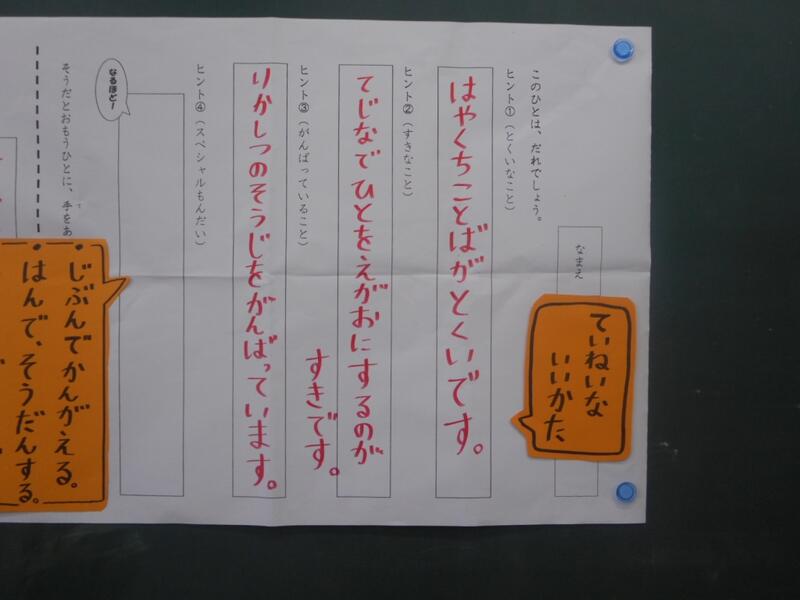 班の誰かを当ててもらいます。ヒントは、友達の良いところ。事前に取材したもの
