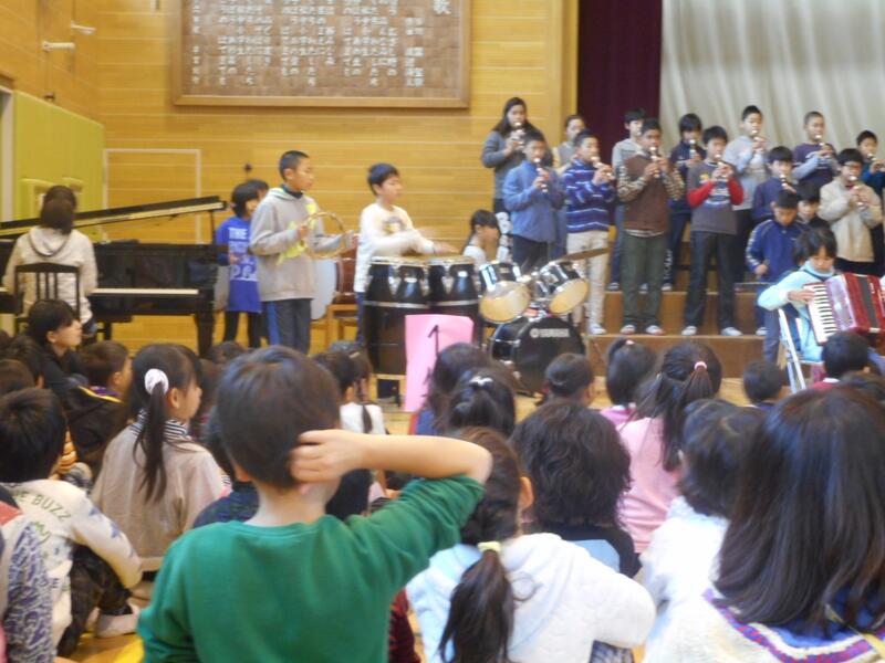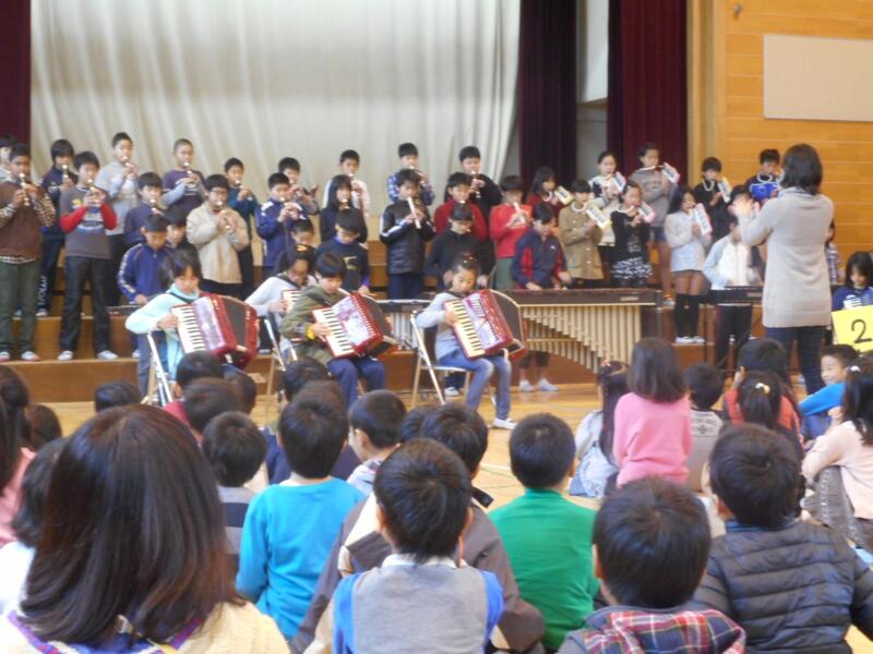今日は、音楽朝会で、在校生に合唱と合奏を披露しました。