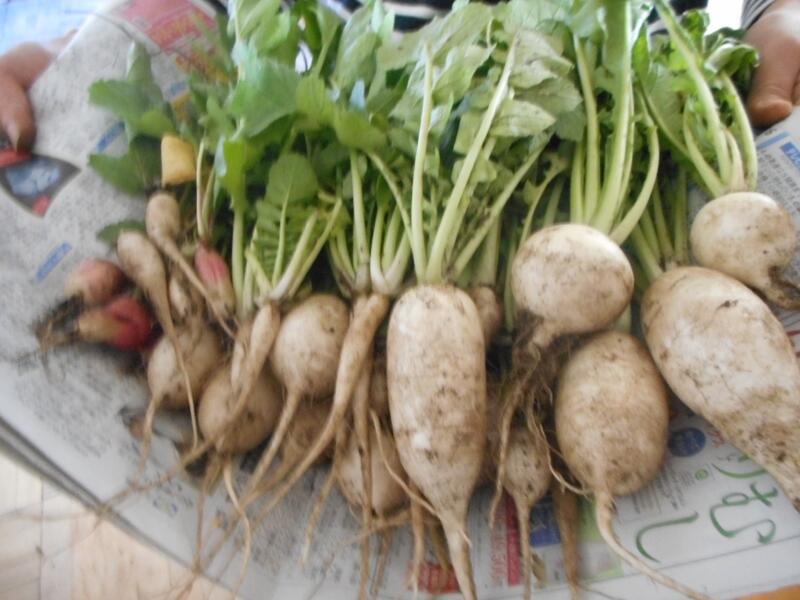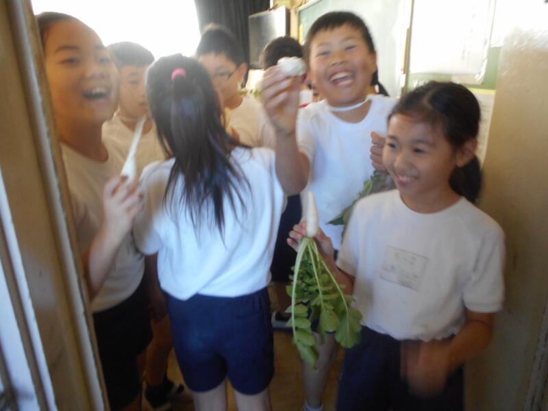 5年生の教室を通ると、大根が。「涙をのんで間引きました。」とのこと。