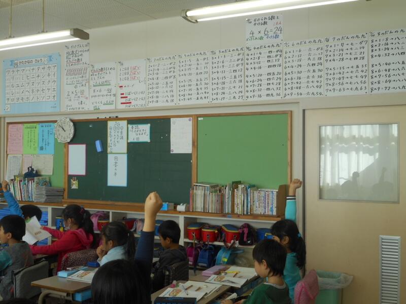 2年生の算数の習熟度別授業。壁面を見ると、おお!今月の九九の学習が一目で分か