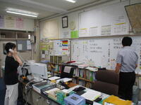 今回は、8月27日に実施した先生たちの研修会の様子をお伝えします。この日、日本赤十字社東京都支部青少年・ボランティア課の有廣様はじめ、立川市赤十字奉仕団の方々にご来校いただき、9月20日(土)の公開授業で全校で実施する防災教育に関する研修会が行われました。(=ご指導、ありがとうございました)