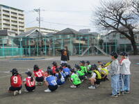 子どもたちは、最初に、ボールを持った手で自分の頭の横を「とんとん」とたたいて、そこから「くるっ」と上半身を回転させて投げる「くるっとスロー」を学んでから、2人組でキャッチボールをしました。その後、徐々に距離を広げての試技を行いました。