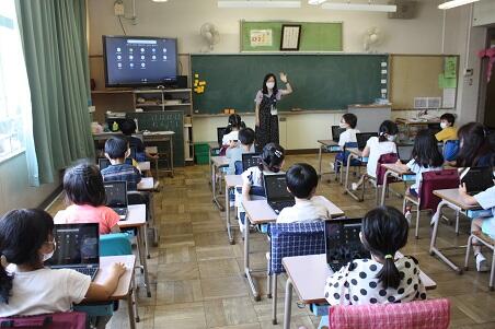 国語では、夏休みの思い出を友達に紹介する学習をしました。発表を聞いて質問の手がたくさん挙がりました。