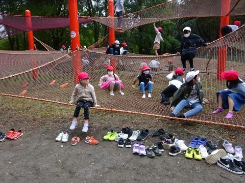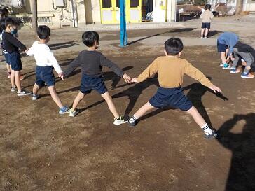 ハイハイ ケンケン スキップ 膝を高く上げながらゆっくり走る 膝で歩く 後ろ向きで進む などをしました。座ったまま足を延ばしてお尻で進むむのが一番疲れました。動物のまねっこなども楽しそうですね。
