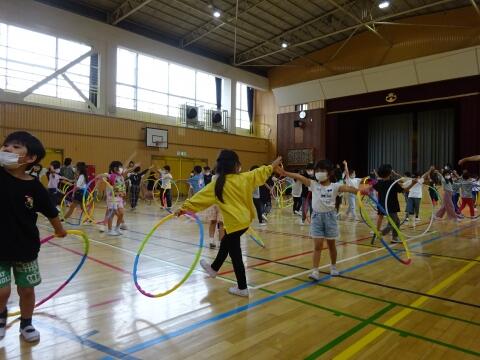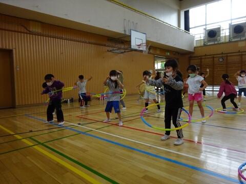 フラフープを使ったダンスでは、ペアの友達と相談してメリーゴーラウンドの回る方向と、最後のポーズを決めて練習しました。