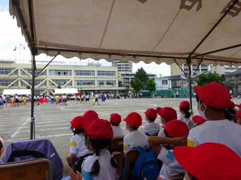 他学年の競技の間は席で応援。徒競走では「がんばーれ!がんばーれ!」2年生と一緒に大きな声援を送りました。