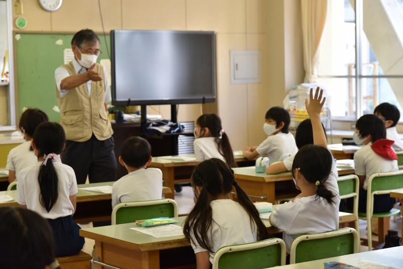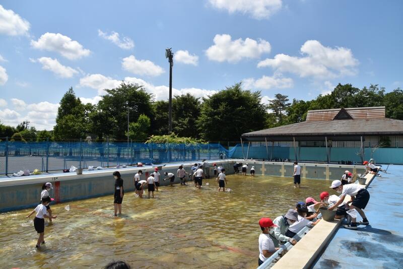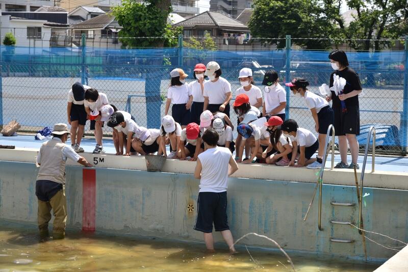 地域の人からヤゴの生態の話を教えていただいてから、プールに向かいました。