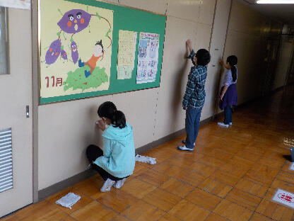 *50周年を記念して、大山小学校をみんなできれいにしよう!という活動を4時間目に行いました。5年生と2年生で協力をして、全員で学校中の壁をきれいにしていました。1時間近く集中して掃除をする姿から高学年の頼もしさを感じました。